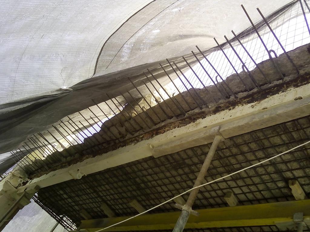 Οι διαβρώσεις των οπλισμών ήταν ιδιαίτερα έντονες στην πλάκα και τις δοκούς, για αυτό και έχουν τοποθετηθεί υποστυλώσεις.